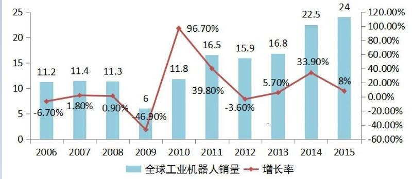 當前全球機器人市場規模不斷擴大,我國機器人產業發展勢頭迅猛,2015年國產自主品牌工業機器人占我國市場份額首次突破30%,未來機器人需求潛力巨大,當前是機器人產業蓬勃發展的關鍵機遇期,要抓住機遇,發展壯大自主品牌,全面提升我國機器人產業核心競爭力。 據國際機器人聯合會統計,全球機器人市場規模不斷擴大,2015年全球工業機器人銷量超過24萬臺,同比增長8%。2006-2015年,全球工業機器人銷量年均增速約為14%。2014年亞洲銷量約占2/3,中國、韓國、日本、美國和德國五大市場的銷量占全球工業機器人總銷量的75%左右。近十年全球工業機器人銷量見圖1所示。2014年全球專用服務機器人銷量為2.4萬臺,較2013年同比增長11.5%;銷售額達到37.7億美元,較2013年同比增長3%。2014年,全球個人/家用服務機器人銷量約為470萬臺,較2013年同比增長28%;銷售額達到22億美元。鑫泰數控加工中心機器人龍門